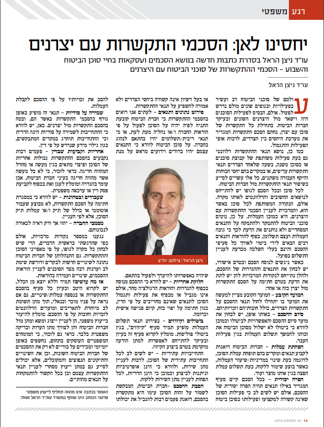 - יעוץ לסוכנים בנושא הסכמי התקשורת מול חברות ביטוח ו/או יצרנים שונים בהיבטים משפטיים ומסחריים.
